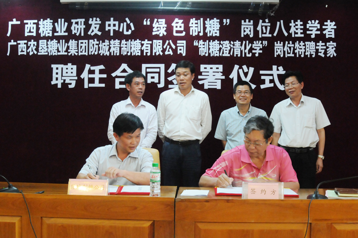 签署仪式上,马步副总司理与梁达奉教授等“绿色制糖”岗位八桂学者、防城精制糖有限公司董事长李强与“制糖澄清化学”岗位特聘专家刘和清教授签署聘用条约。