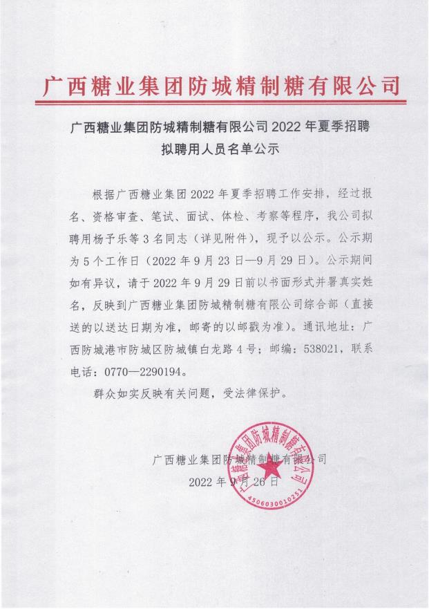广西糖业集团防城精制糖有限公司2022年夏日招聘拟聘用职员名单公示